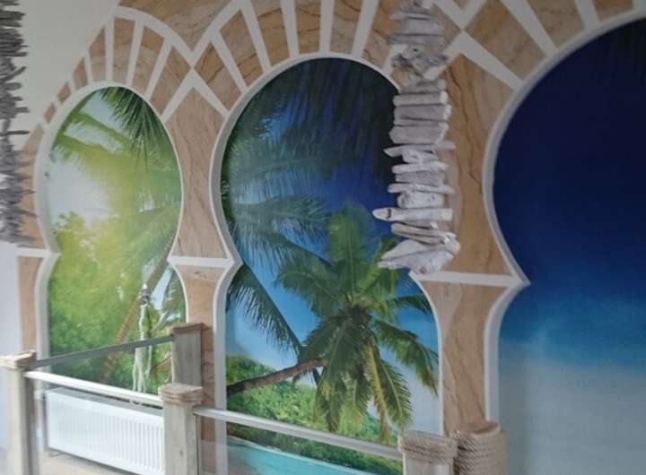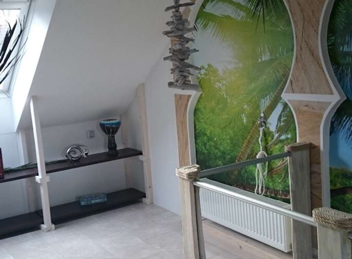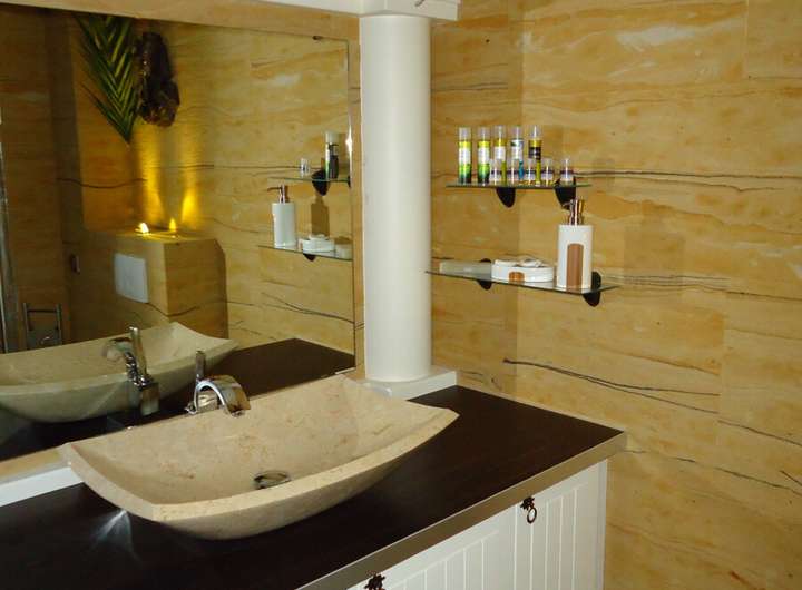 Im Wohnbereich wurde Laminatfußboden verlegt, während der Wintergarten, Teile des Badezimmers sowie einzelne Schlafräume im ansprechenden mediterranen Stil gestaltet sind. Das Badezimmer verfügt über eine ebenerdige Regenfalldusche, die ein modernes und komfortables Wellnesserlebnis bietet.