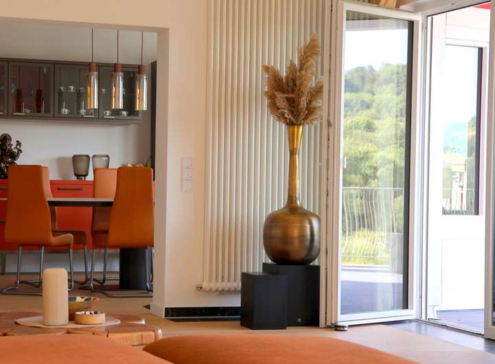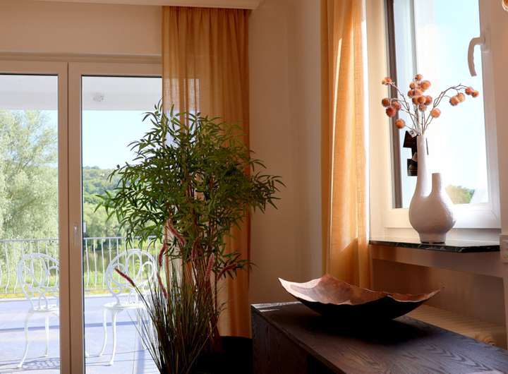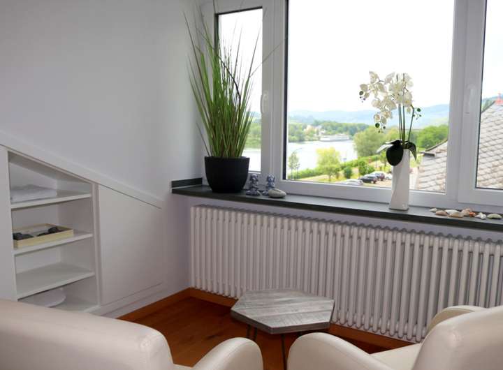 Lichtdurchflutet bildet die Wohnebene mit großer Diele, Küche, Speisekammer, Esszimmer mit Erker, großem Wohnzimmer und Bibliothek, das Herzstück dieses komfortablen Domicils. Die besondere Symbiose der Architektur kombiniert mit herausragenden Ausblicken auf die Mosel & die 60 qm große Terrasse begeistern. Edle Echtholzböden und der Glanz der Marmorkerböden unterstreichen die luxuriöse Umgebung.
