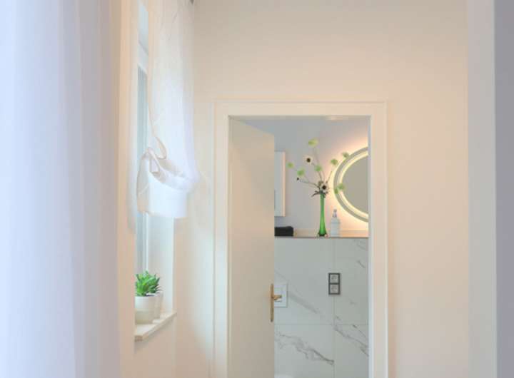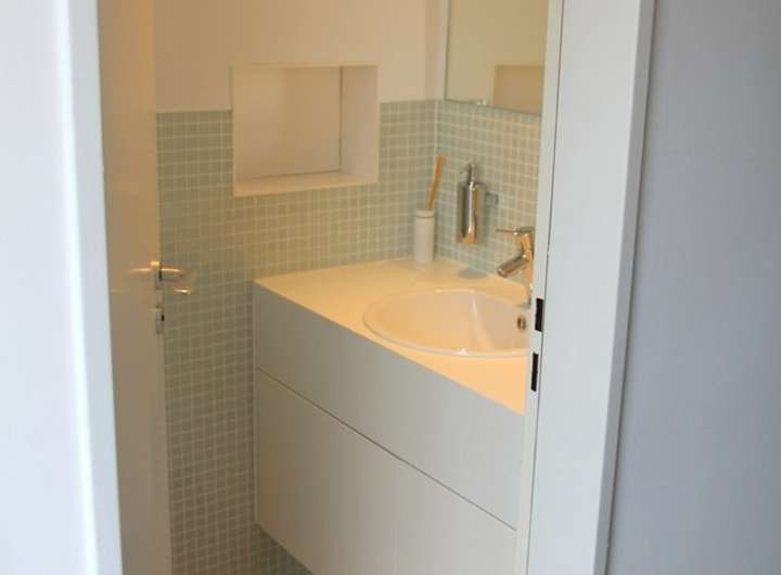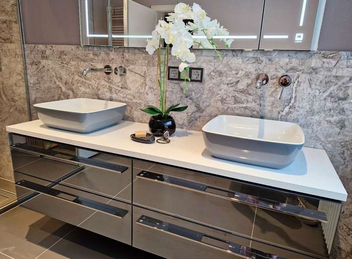 - 1 Gäste-WC, 2 moderne Duschbäder mit Badschränken, Leuchtspiegel usw.