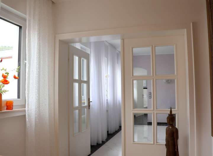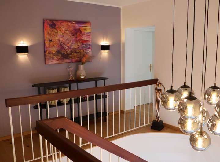 Über den Hauseingang an der Rückseite des Gebäudes gelangt man zum großzügigen Wohnbereich, der sich mit ca. 380 qm auf mehreren Ebenen erstreckt.