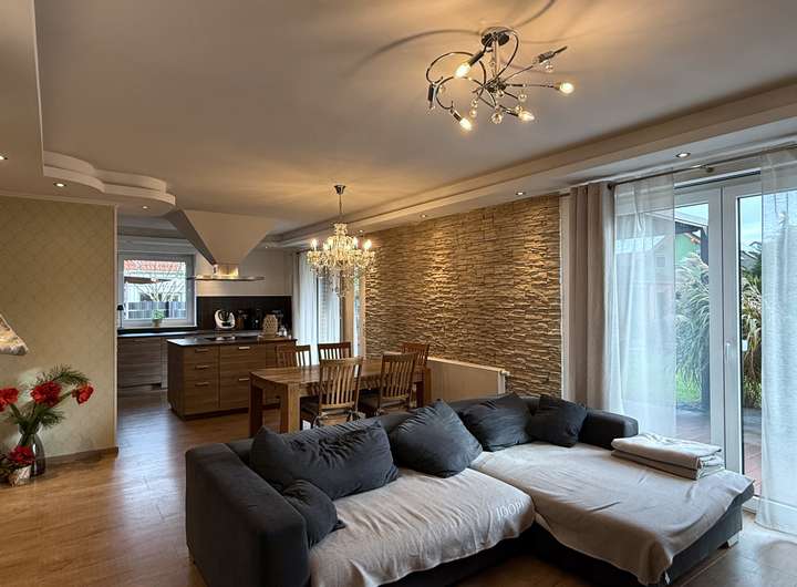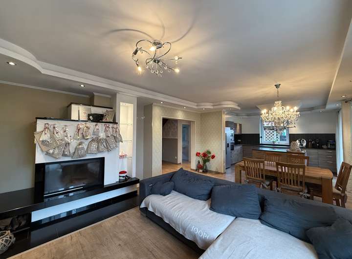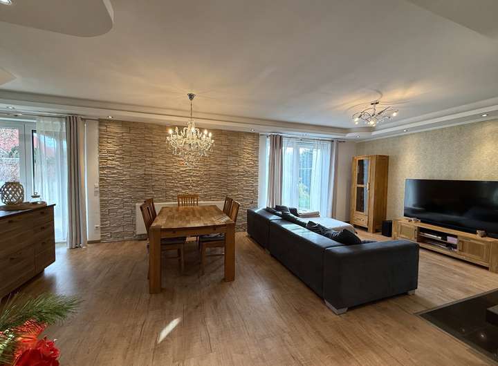 Der große Wohnessbereich mit seinen teils bodentiefen Fenstern bietet Platz für Ihre Familie.