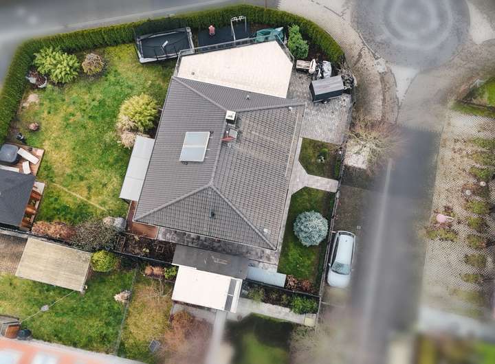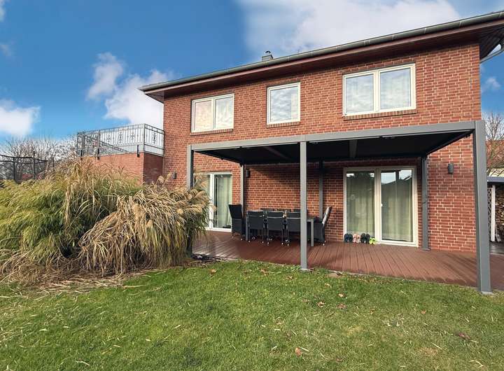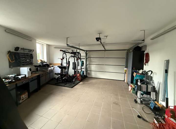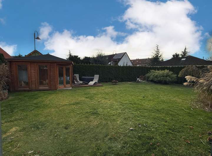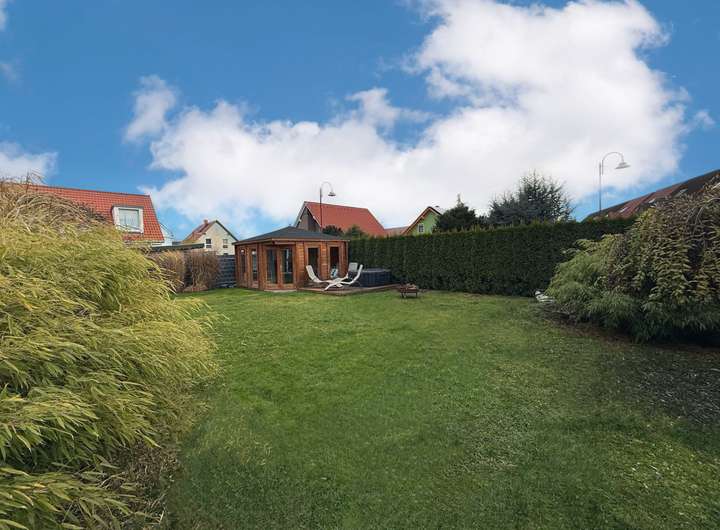 Das Grundstück ist familiengerecht angelegt. Ausreichend Platz bietet sich für Spiel, Sport, Spaß, Wellness und auch zum Ausruhen und für Festlichkeiten. In der Garage können Sie Ihr Auto und Fahrräder oder ein Motorrad abstellen, und außerdem verfügt die Garage über einen kleinen Fitnessbereich und die Heimwerkstatt. Das Dach der Garage dient als große Dachterrasse mit Zugang aus dem Schlafzimmer und dem Bad im Obergeschoss.