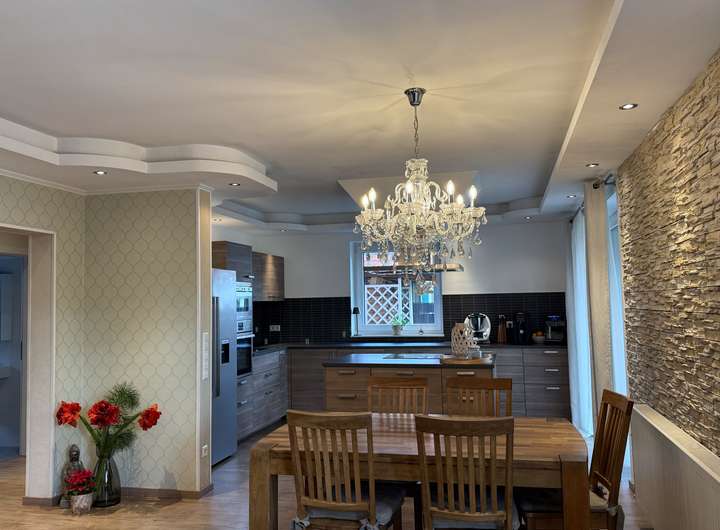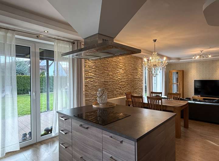Ein Marmorkamin der Firma Haak lässt Sie Ihre ruhigen Stunden genießen, ebenso die hochwertige Küche mit einer Kochinsel als Raumteiler. Da bekommen Sie doch sofort Lust auf einen Saunagang, denn der Blick in den Garten fällt auch auf das Saunahaus mit einer Sauna, die Ihre Gesundheit und Gelassenheit auf ein neues Level bringt.