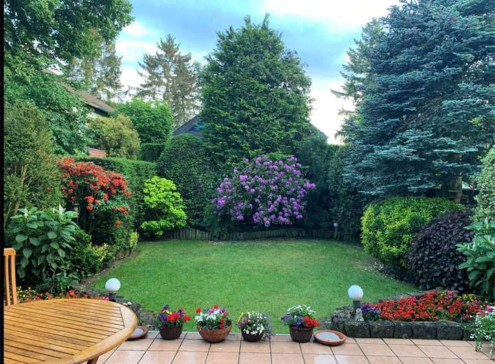 - Rasenfläche von Büschen und kleinen Bäumen eingerahmt