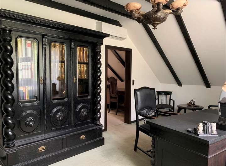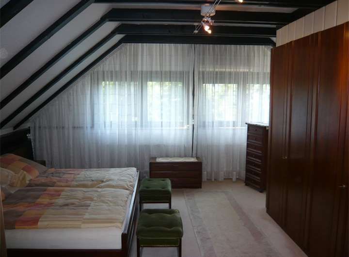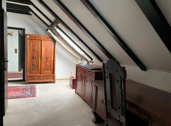 - Schrägen mit sichtbaren Balken (dunkelbraun), tapezierte, weiß gestrichene Zwischenräume