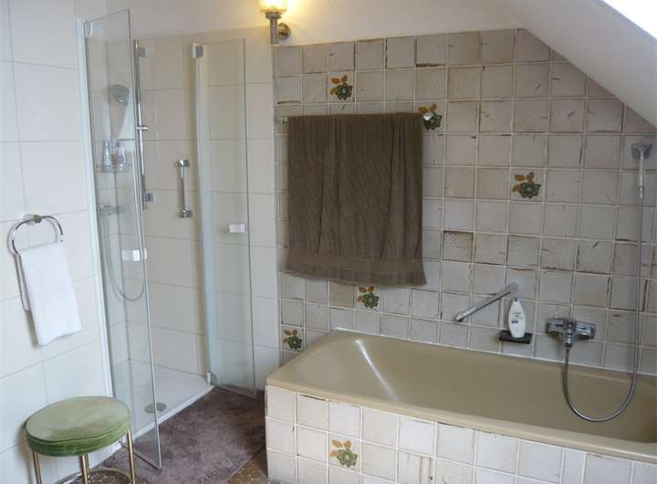- beige gefliestes, geräumiges Badezimmer mit Badewanne, Dusche, Fenster (ohne WC)