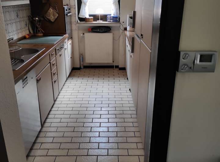 - beige Einbauküche, beige gefliester Boden, Dunstabzug nach außen