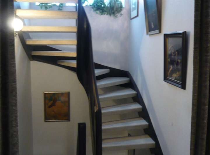 - freitragende Holztreppe offen zum Wohnbereich, Stufen mit Teppich bezogen