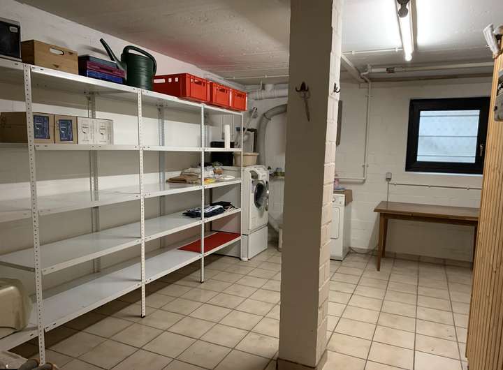 großer Hobbyraum, ca. 30 m² mit Heizkörper, Heizungskeller, kleiner Vorratsraum, großer Raum mit Waschmaschinenanschluss, Sauna und Tür zum Vorgarten; von außen zugänglicher Fahrradkeller