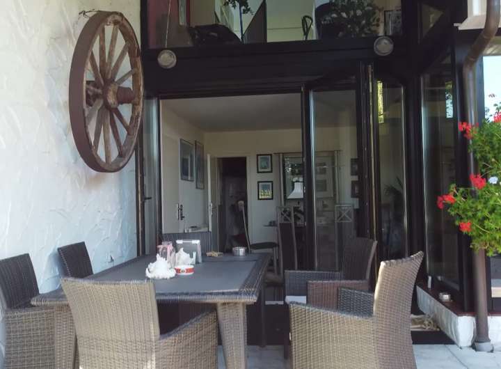 Über eine moderne stufenlose Faltschiebetür gelangt man vom Wohnzimmer direkt auf die überdachte und windgeschützte Terrasse mit Blick auf den schön angelegten Gartenteich mit Wasserfall.