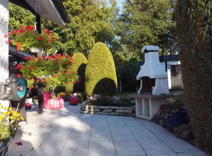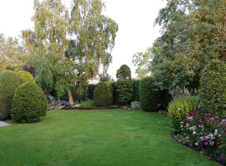 Hervorzuheben ist, dass der nach Süden ausgelegte Garten durch seinen tollen Baumbestand im Sommer absolut blickdicht ist. Hinter der großen Hecke befindet sich ein weiteres Grundstück, welches nicht bebaut werden darf, hier genießt man also absolute Ruhe.