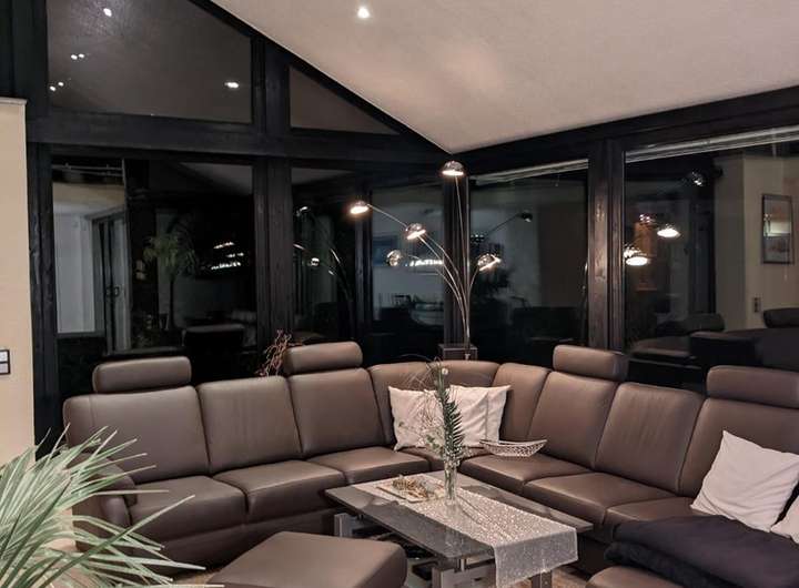 Im Erdgeschoss des Wohnhauses stehen Ihnen neben dem großzügigen Eingangsbereich die hochwertige Einbauküche mit Spülmaschine, Markeninduktionskochfläche sowie Side by Side Kühl/Gefrierkombi nebst Essecke mit Zugang zum Wohnzimmer und Abstellraum ( Hinterküche ), zwei Schlafzimmer, ein Büro mit Zugang zum Garten, ein großer Wohnbereich mit imposanter Fensterfront bis in den Giebel, mit Kaminofen, das Badezimmer mit Badewanne sowie Dusche zur Verfügung.
