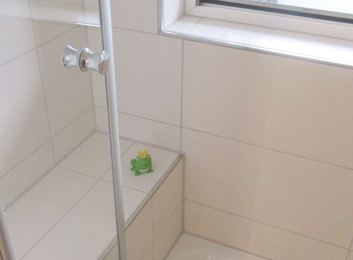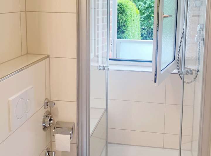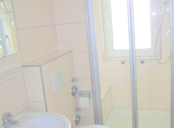 Ein modernes Tageslichtbad mit Echtglasdusche und Sitzbank bietet zusätzlichen Komfort.