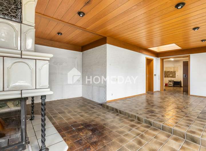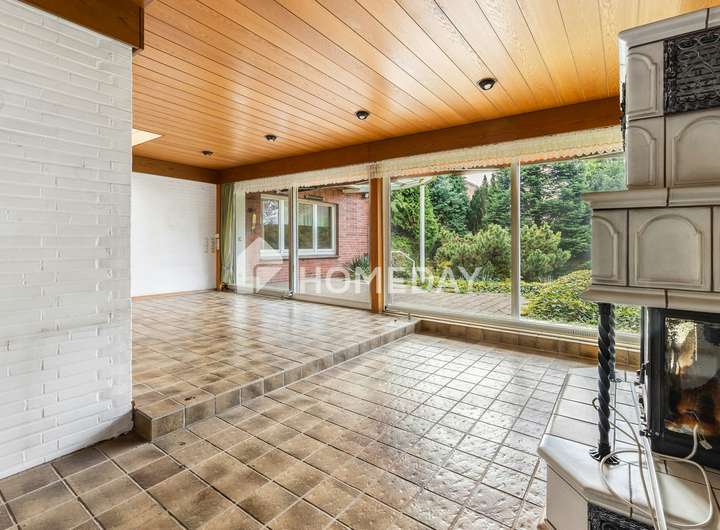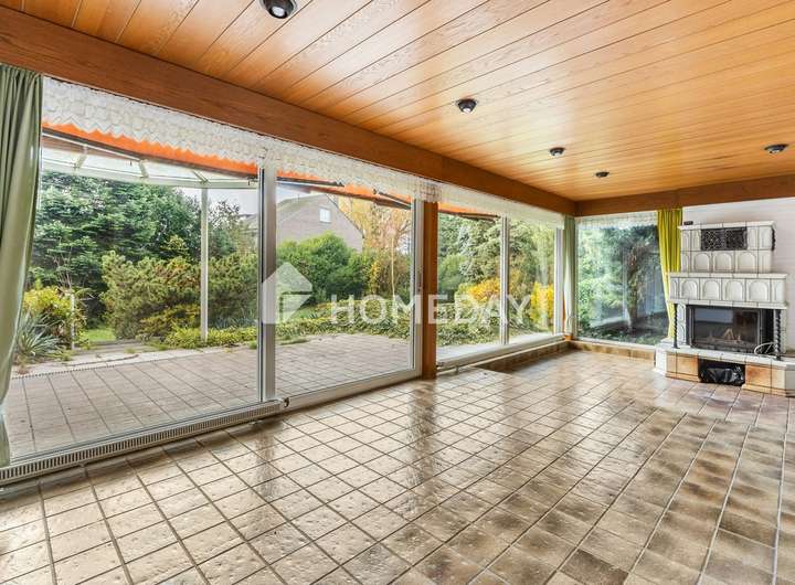 Ein besonderes Highlight ist der Anbau aus den 1980er-Jahren, der ursprünglich eine Terrasse war, später jedoch zu einem großzügigen Wintergarten mit Flachdach erweitert wurde. Dieser lichtdurchflutete Bereich bildet das Herzstück des Hauses und lädt ganzjährig zum Entspannen ein. Angrenzend befindet sich ein gemütliches Kaminzimmer, das besonders in den kälteren Monaten eine warme und einladende Wohnatmosphäre schafft.