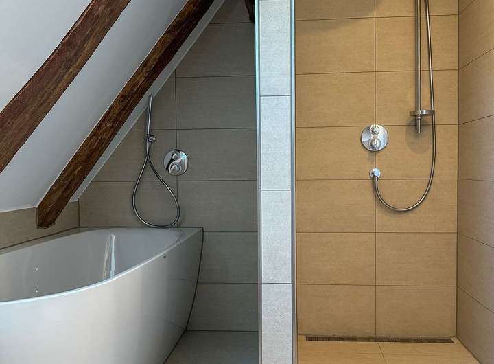 - Bad (Wanne und Dusche) mit großformatigen Fliesen, Walk-In-Dusche, spülrandlosem WC, hochwertigen Armaturen