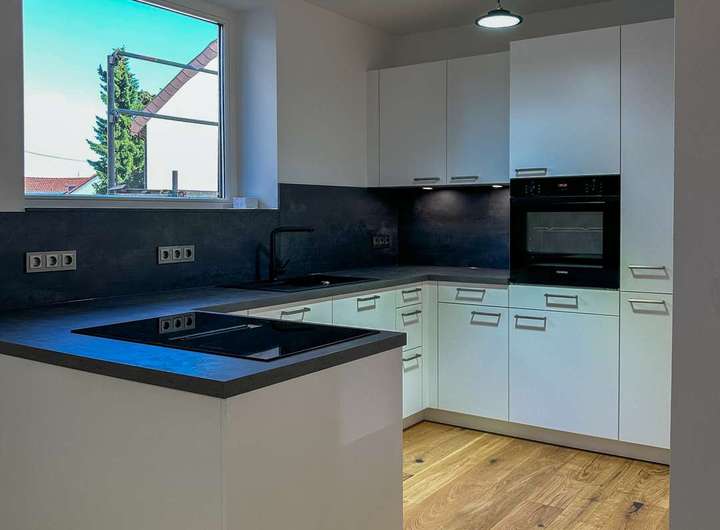 - Einbauküche mit Siemens-Elektrogeräten: Kühl-Gefrierkombination, Backofen, Induktionskochfeld mit Dunstabzug, Spülmaschine