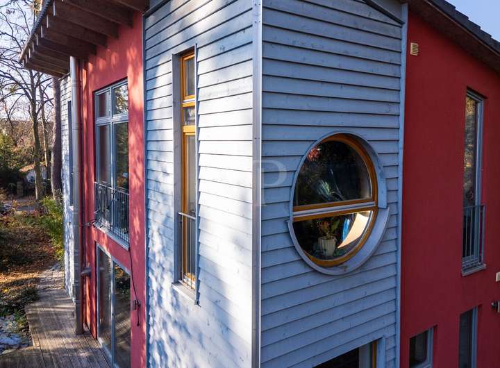 Dieses architektonisch reizvolle Einfamilienhaus wurde 2004 nachhaltig in ökologischer Holz- und Niedrigenergiebauweise erbaut. Auf ca. 144 m² Wohnfläche und einem weitläufigen Grundstück von ca. 1.021 m² findet sich reichlich Platz, um auch höchsten familienfreundlichen Wohnansprüchen gerecht zu werden.