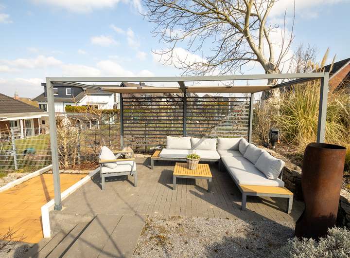 Ein weiteres Highlight ist der aufwändig gestaltete Garten mit 2 Terrassen – eine teilüberdachte mit Echtholzdielen und einer Sonnenterrasse mit Pergola – sowie einer Feuerstelle, einem Gewächshaus und einem großen Schuppen für Gartenmöbel- und Geräte.