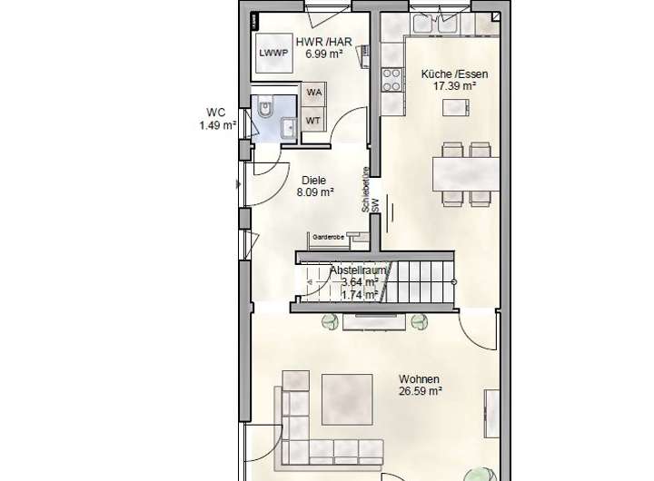 Im Erdgeschoss erwartet Sie eine große, offene Küche mit Essbereich, die einen harmonischen Übergang in das großzügige, helle Wohnzimmer bildet. Dieser offen gestaltete Wohnbereich schafft eine einladende Atmosphäre und ist ideal für gemeinsames Wohnen und geselliges Beisammensein. Ergänzt wird das Erdgeschoss durch ein Gäste-WC sowie einen praktischen Hauswirtschaftsraum.
