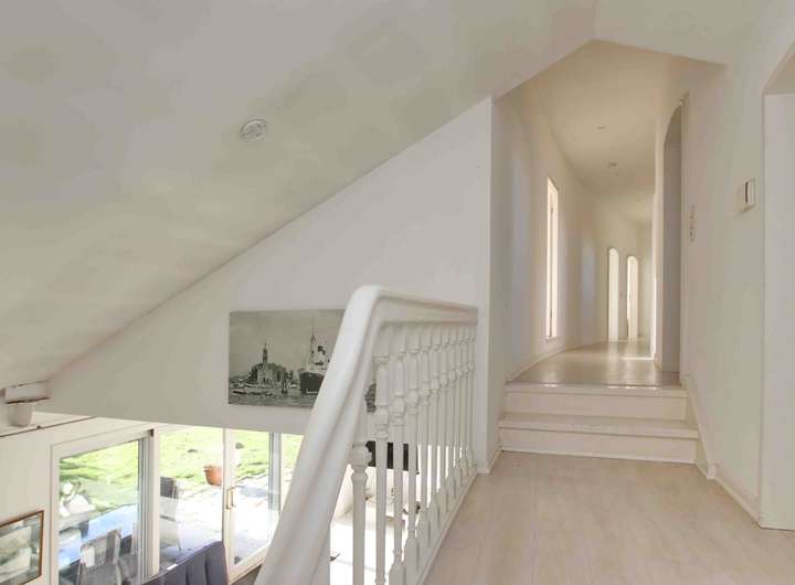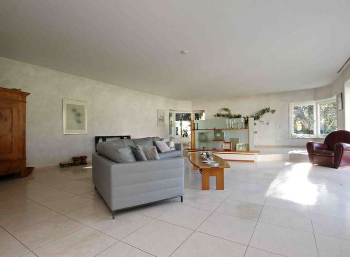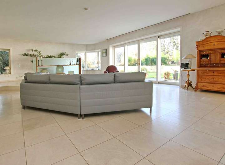 In der Eingangshalle, dem Wohnbereich und der Wohnküche sind Marmorfliesen und hochwertigen Natursteinfliesen verlegt. Die Schlafzimmer sowie die Einliegerwohnung (außer Eingangsbereich) sind mit Parkett ausgestattet. Ein Schlafzimmer im Obergeschoss ist mit einem Korkboden versehen.