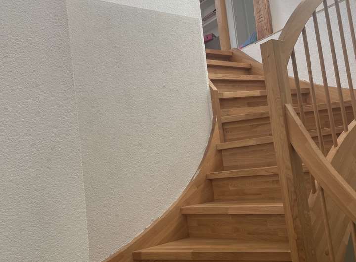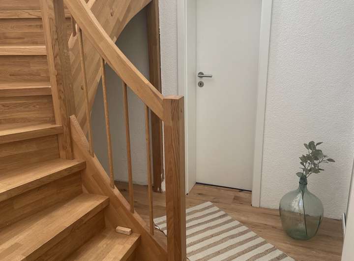 Im Obergeschoss befinden sich das Badezimmer, Schlafzimmer, Ankleide-/Kinderzimmer, Besenkammer, separates WC sowie ein weiteres Treppenhaus.