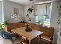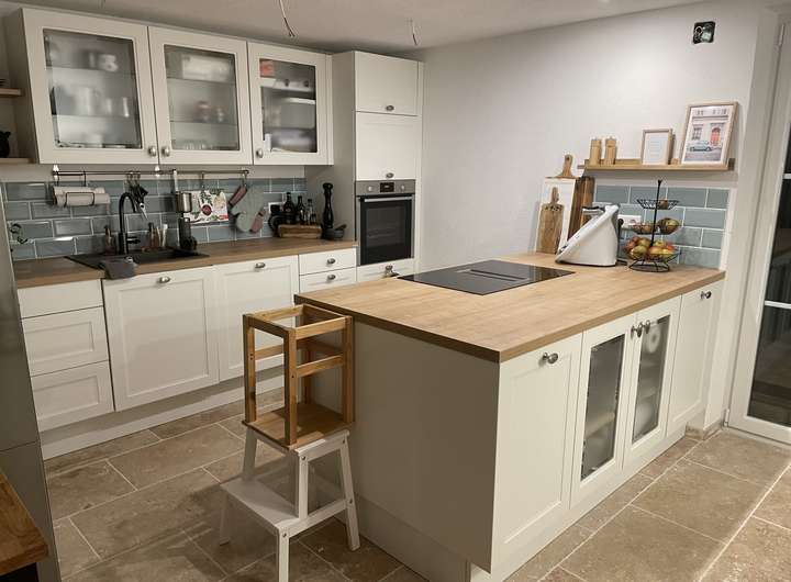 Die 4 Jahre alte Vollholz Einbauküche im Landhausstil bietet alles was das kulinarische Herz höher schlagen lässt ( Kochinsel mit Abzug, Side-by-Side Kühlschrank, Apothekerschrank, überwiegend Auszüge).