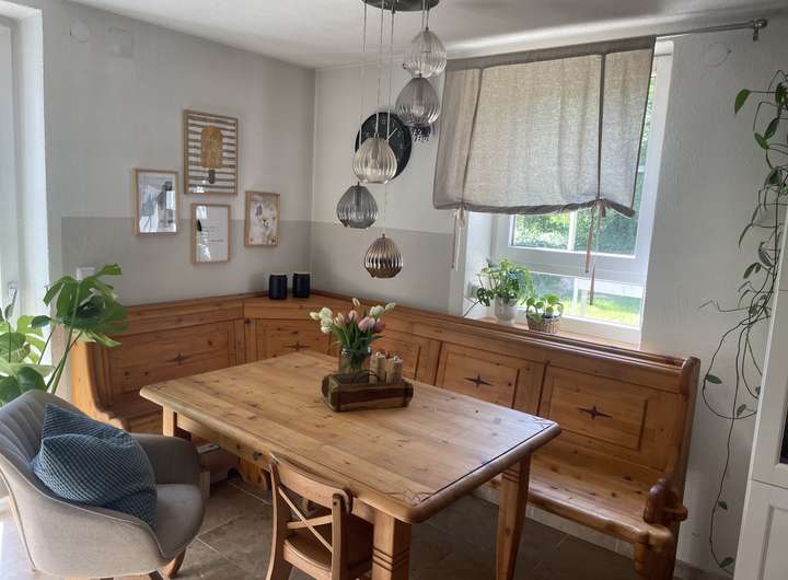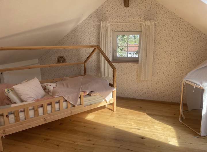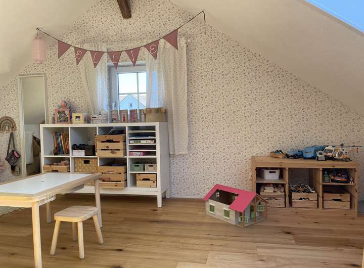 Im Dachgeschoss befinden sich die 2 großen lichtdurchfluteten Kinderzimmer mit einem Zwischenraum der mit freigelegten Fachwerk einen besonderen Charme besitzt und für einen Home Office Arbeitsplatz geradezu perfekt ist.