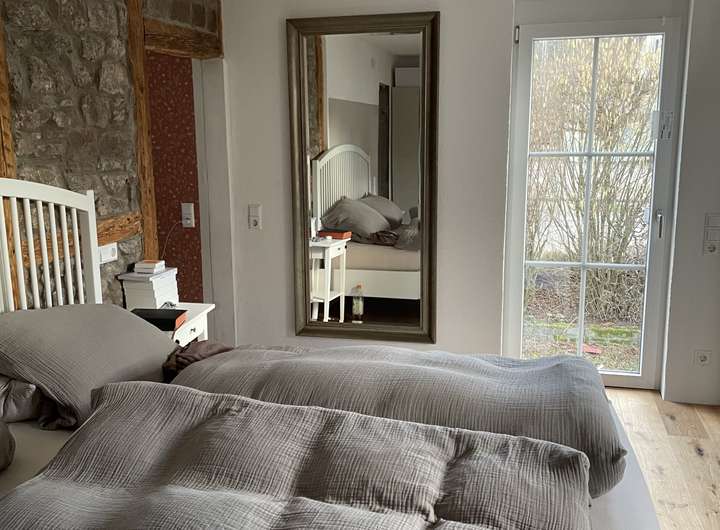 Das übergroße Schlafzimmer hat ein angrenzendes Ankleidezimmer mit eigenem Badzugang. Es ist zusätzlich möglich einen Kaminofen zu installieren.