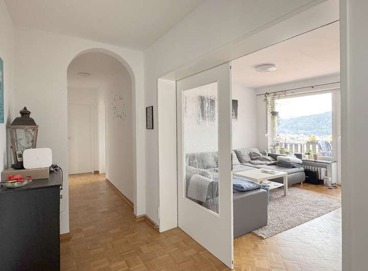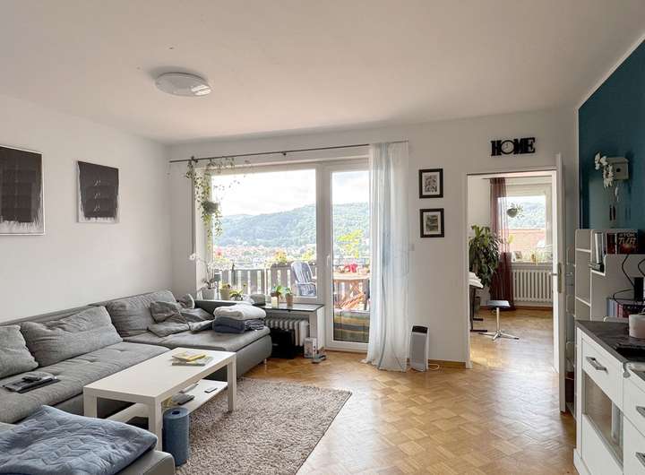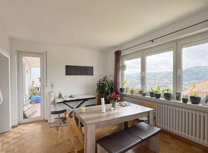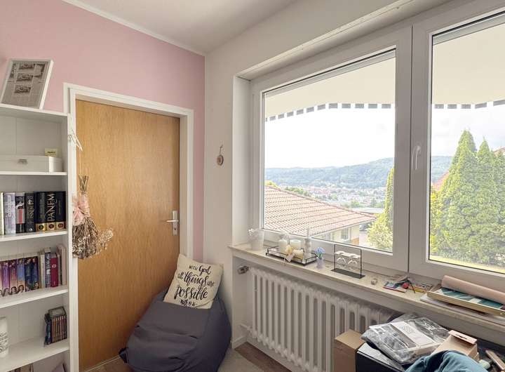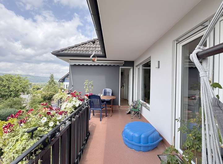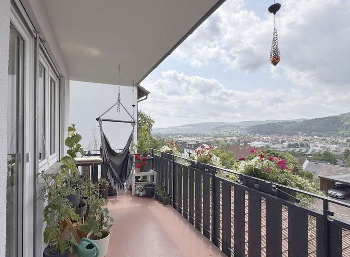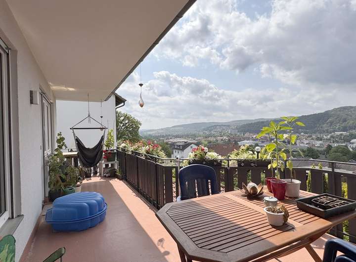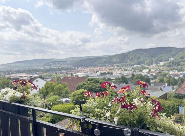 Sehr sonnig und beste Südhanglage mit tollem Ausblick vom Balkon über die Stadt, rückseitig unverbauter Blick in grüne Waldrandlage.