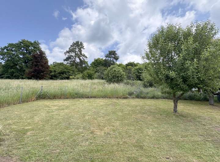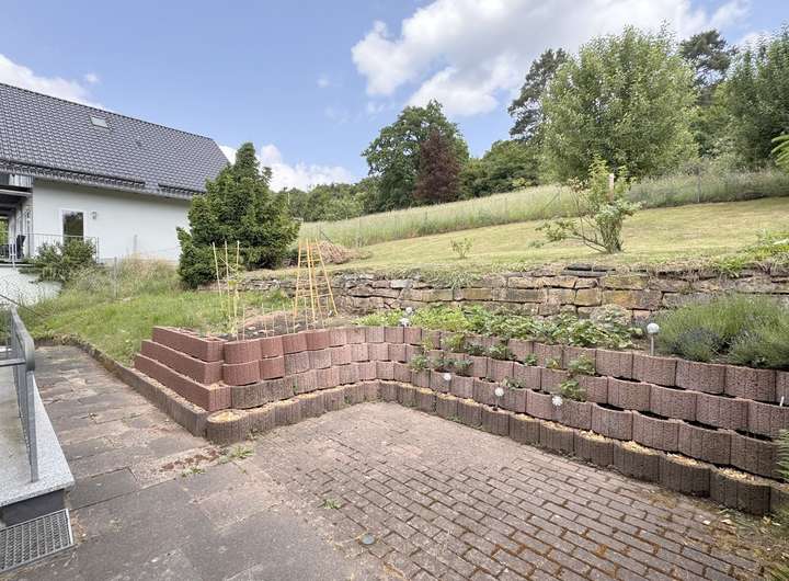 Garten mit teilweise begradigter Rasenfläche, hinterer Grundstücksteil in Hanglage, zweite Terrasse hinter dem Haus.