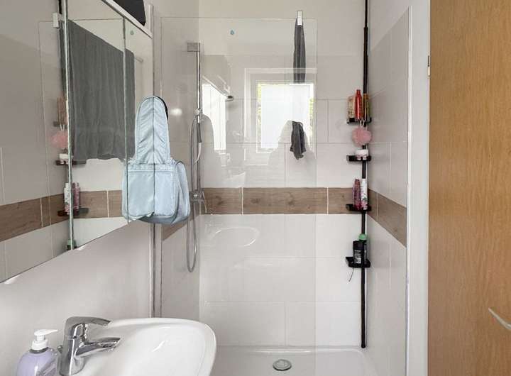 ca. 64 qm: 3 (Schlaf-) Zimmer oder alternativ 1 Küche (Anschlüsse vorhanden), neues Tageslichtbad mit Dusche, Terrasse.