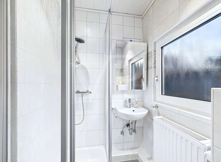 Das Obergeschoss wurde 1996 nachträglich ausgebaut und um zwei Gauben erweitert. Für alle Maßnahmen liegen die entsprechenden Genehmigungen vor. In dem Zuge entstand hier eine vollwertige Einliegerwohnung, die über einen separaten Zugang im Erdgeschoss betreten wird. Der kleine Eingangsflur führt über eine Treppe direkt ins Obergeschoss. Dort befindet sich zunächst ein Flur, von dem aus das Duschbad, das Wohnzimmer und die Küche mit moderner Einbauküche zugänglich sind. Die Küche dient gleichzeitig als Durchgang zu einem Zwischenflur, der zu einem Kinderzimmer sowie einem großen Elternschlafzimmer führt. Zusätzlich bietet die Küche einen praktischen Abstellraum und den Zugang zur Dachterrasse, die der Einliegerwohnung einen besonderen Mehrwert verleiht.