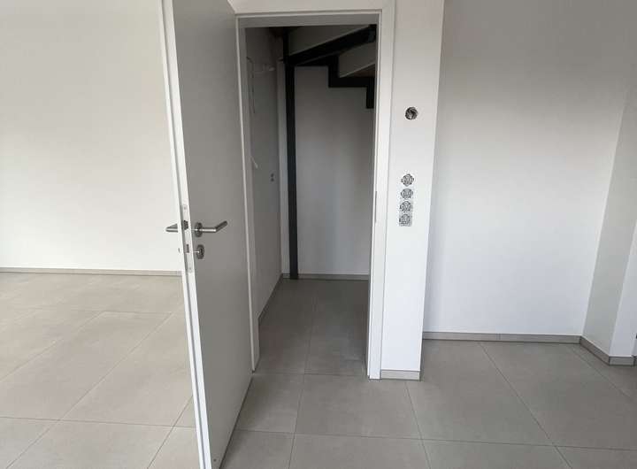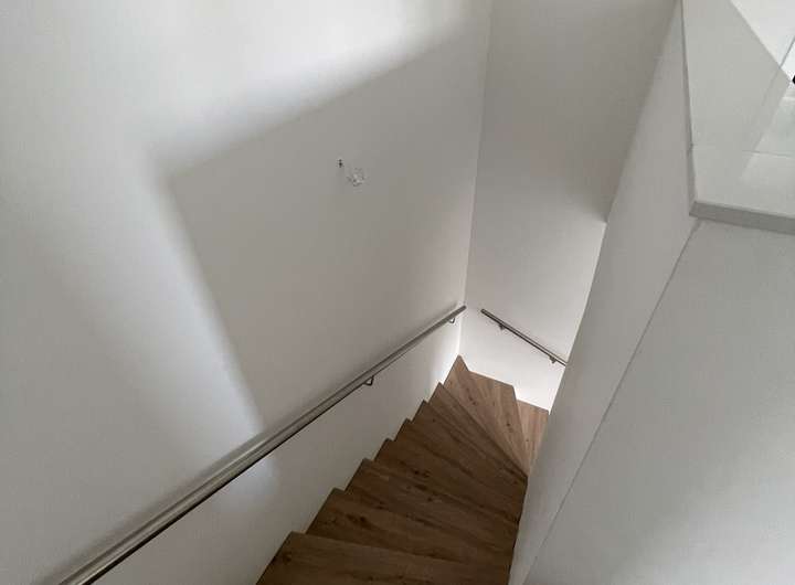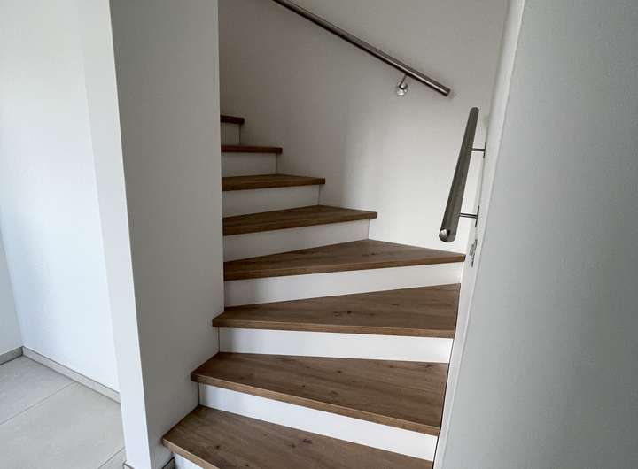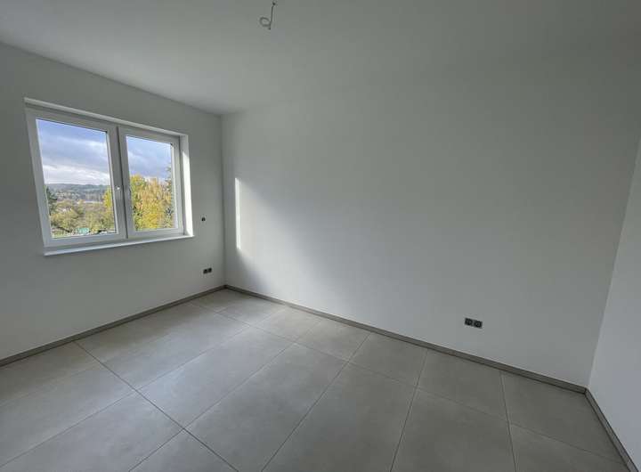 Das Obergeschoss bietet ein Elternschlafzimmer, zwei helle Kinderzimmer sowie ein modernes Badezimmer. Ein zusätzlicher Abstellraum sorgt für weiteren Stauraum. Der Balkon bietet einen schönen Rückzugsort mit Blick ins Grüne.