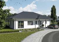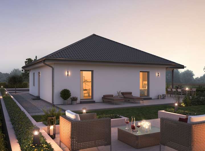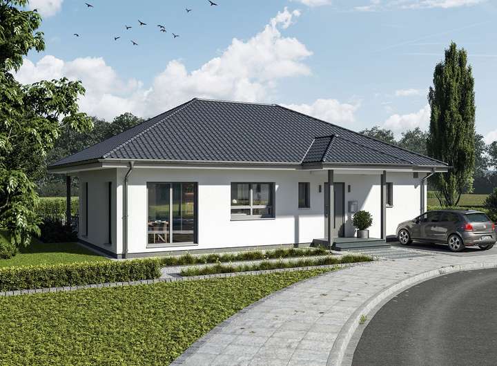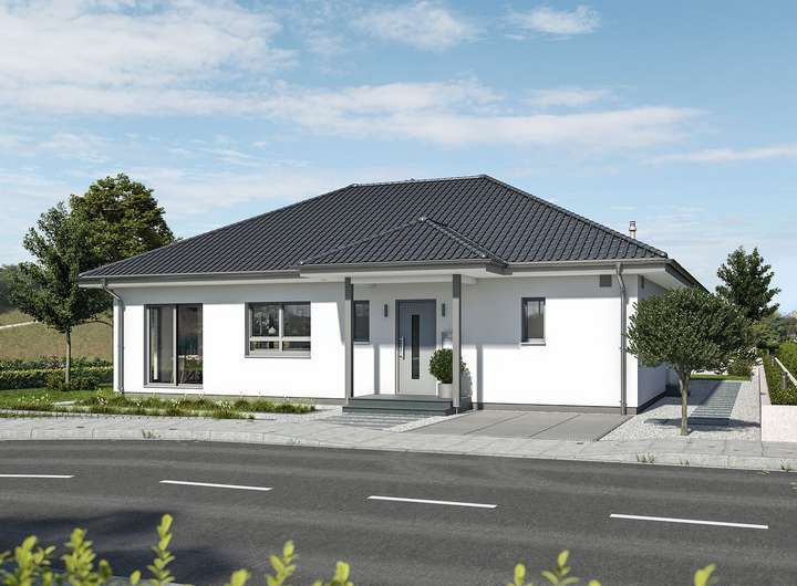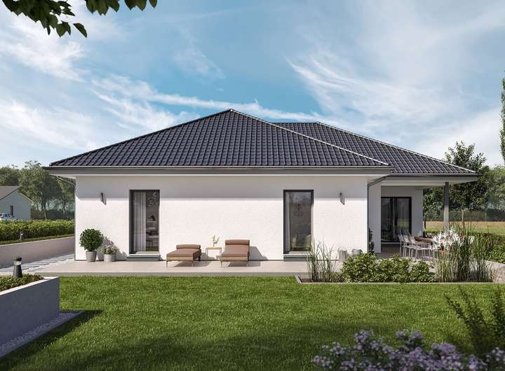 Besonders spannend zeigt sich die Grundrissform des Bungalows ComfortStyle 14.02 W: Hier entschieden sich die Architekten für eine verwinkelte Grundrissform, die allen Ansprüchen einer individuellen und doch funktionalen Lebensart gerecht wird. Dabei überzeugt die klare und geradlinige Architektursprache in jeder Hinsicht. Mit einem Walmdach, welches über die Terrasse reicht, entsteht zusätzlich ein geschützter Freisitz für entspannende Momente im Garten. Die Gesamtfläche des ComfortStyle 14.02 W beträgt ca. 147 m² (Nettogrundfläche nach DIN 277) und bietet Wohlfühlwohnen auf einer Ebene. Das dreiseitig belichtete Esszimmer mit der offenen Küche verströmt Atmosphäre und lädt zum Verweilen ein. Zwei Kinderzimmer, das Elternschlafzimmer sowie Hauswirtschaftsraum, Gäste-WC und Familienbad sind ansprechend in diesem außergewöhnlichen Bungalow platziert. Wohnzimmer und großzügiger Flur runden das Ensemble ab. Weitere Ausdrucksstärke gewinnt das ComfortStyle 14.02 W im Inneren - besonders bemerkenswert für einen Bungalow - durch den zusätzlichen Freiraum der serienmäßig höheren Wände. Großzügig wohnen, intensiv leben: In diesem in nachhaltiger Bauweise errichteten Bungalow fühlen sich die Bewohner rundum wohl!