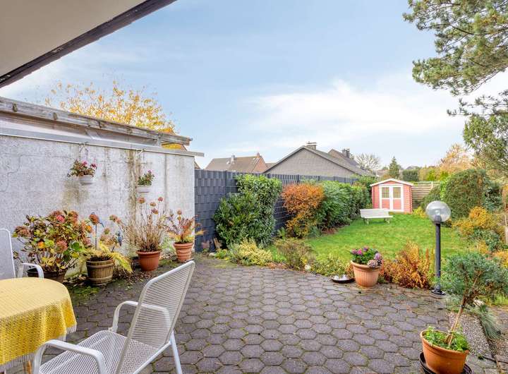 Der gepflegte, kleine Garten mit Gartenhaus lädt zum Entspannen ein und bietet Kindern einen sicheren Spielraum.