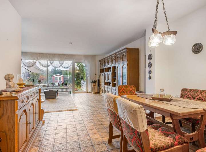 Im Eingangsbereich erwarten Sie die Küche, ein Gäste-WC sowie der großzügige Wohn- und Essbereich mit einem schönen Blick in den Garten. Große Fenster sorgen für viel Tageslicht und schaffen eine angenehme Wohnatmosphäre.