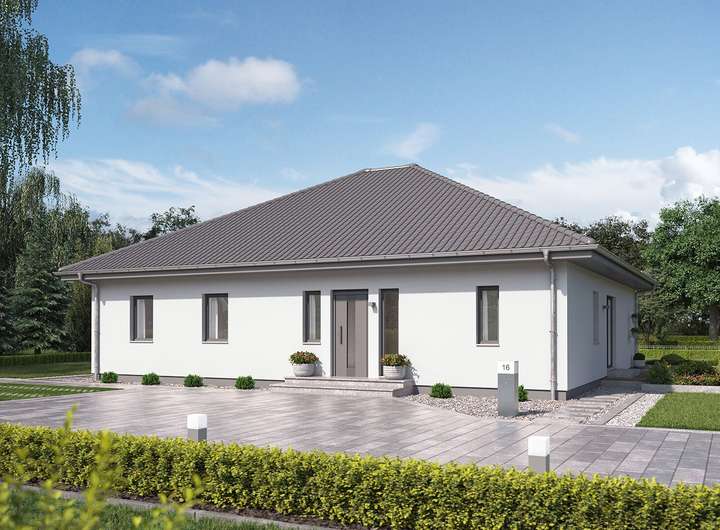 Der Winkelbungalow ComfortStyle 16.01 W mit attraktivem Walmdach verbindet ein modernes Wohngefühl mit zahlreichen funktionalen Aspekten. Auf einer Wohnfläche von ca. 168 m² lassen sich viele Ideen kreativ umsetzen. Ein großzügiger Wohn-Ess-Bereich, das geräumige Bad sowie viele intelligente Angebote für Stellfläche und Stauraum zeichnen das ComfortStyle 16.01 W aus. Dabei überzeugt die klare und geradlinige Architektursprache in jeglicher Hinsicht.