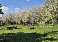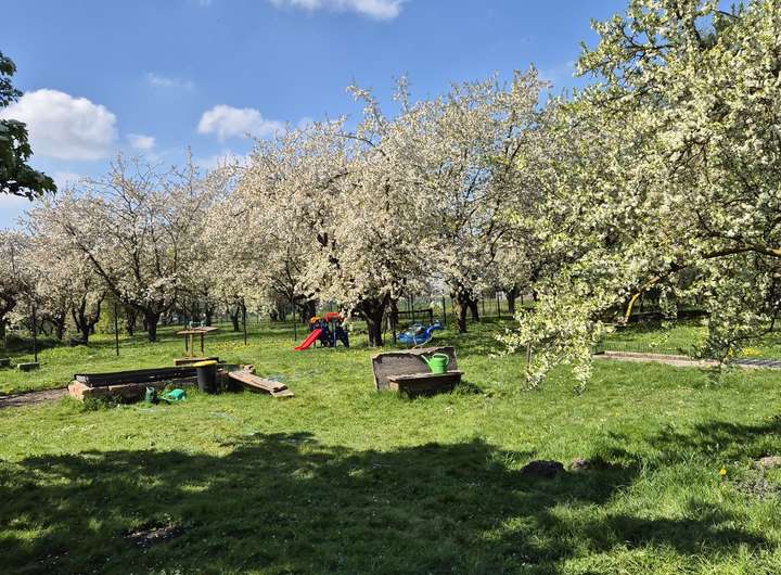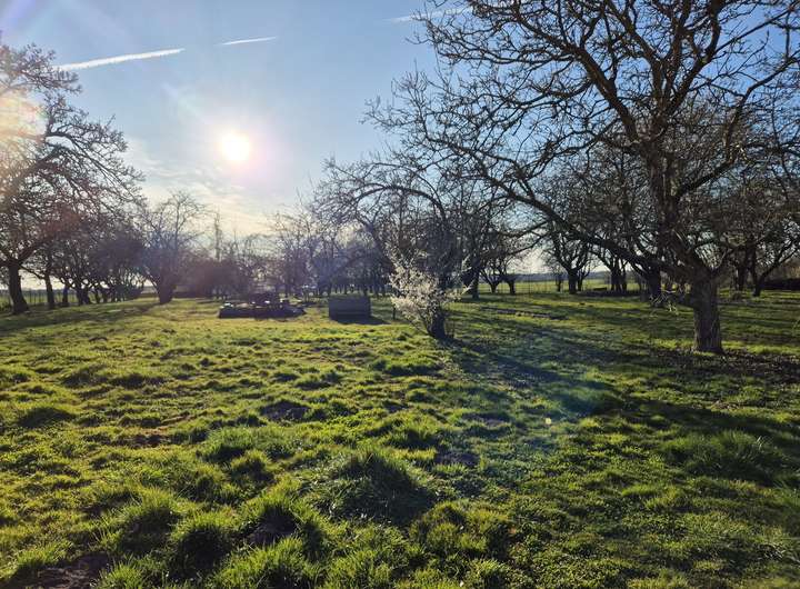 Der Außenbereich, mit großen Wiesen und Landwirtschaftsflächen, ist liebevoll angelegt: Hier finden Sie sowohl Ruhezonen zum Seele baumeln lassen. und wunderschöne Sonnenuntergänge genießen, wie auch die Wirtschaftsfläche mit 121 Obstbäumen - verschiedene Sorten Kirsche, Pflaume, Birnen, Apfel und Walnuss. sowie diverse Obststräucher.