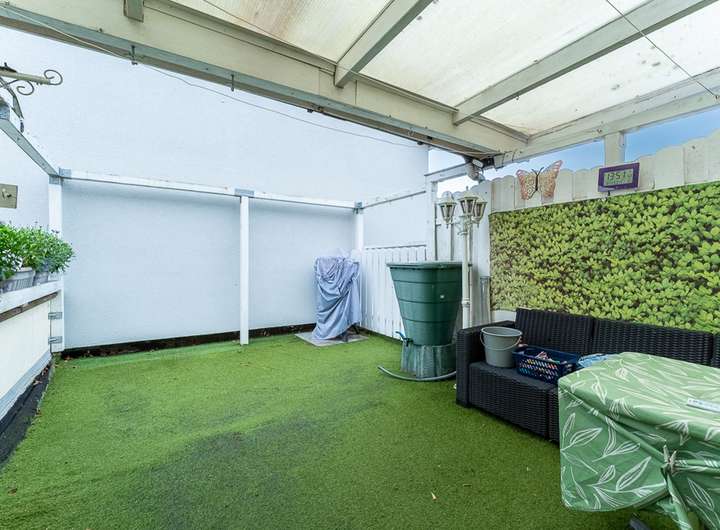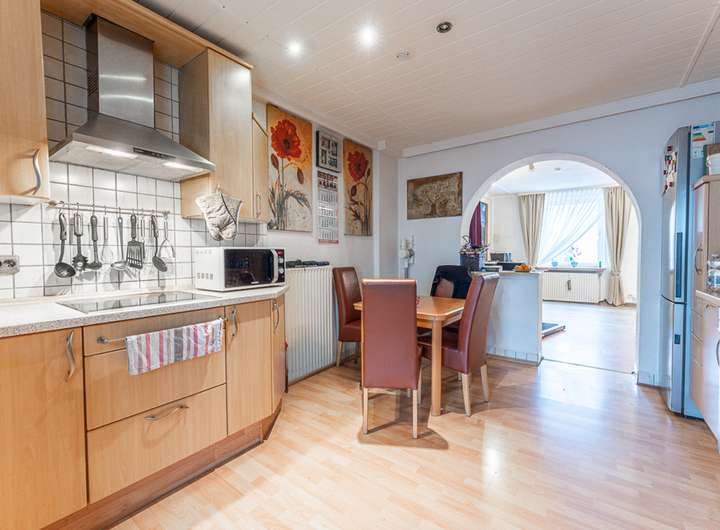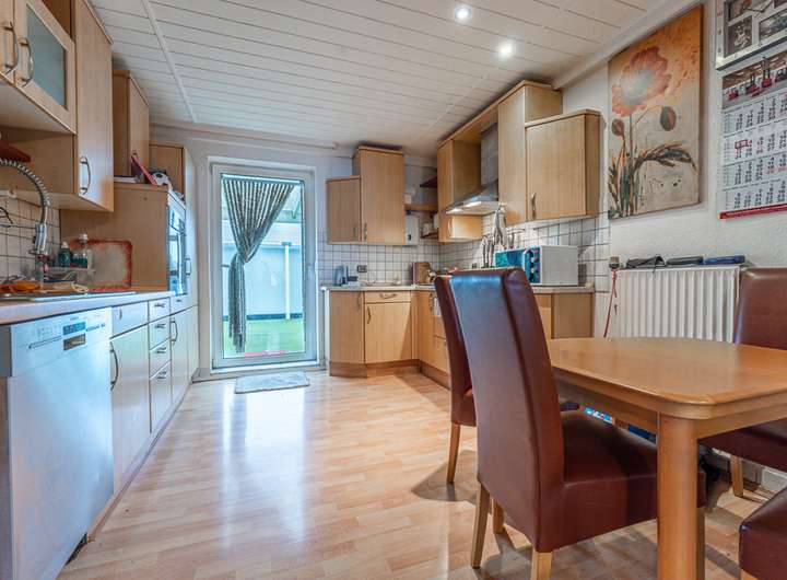 Die beiden Wohneinheiten sind jeweils mit einer Einbauküche ausgestattet. Die Küche im Erdgeschoss wurde 2018 erneuert und präsentiert sich modern und gepflegt, während sich im Obergeschoss die ältere, funktionsfähige Küche befindet. Eine teilweise überdachte Terrasse im Obergeschoss erweitert den Wohnraum und bietet einen angenehmen Außenbereich.