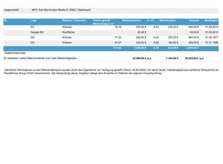 (*) Die Angaben zu den aktuellen Mieteinnahmen basieren auf Auskünften des Eigentümers (Stand: 10/2025). Für die Richtigkeit und Vollständigkeit dieser Angaben übernimmt die PlanetHome Group GmbH keine Haftung.