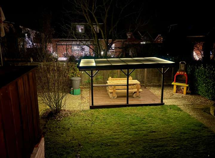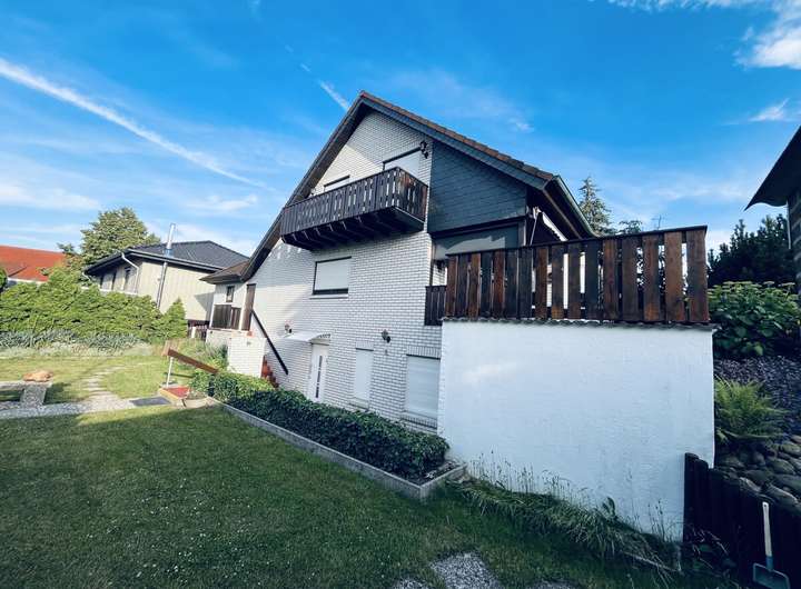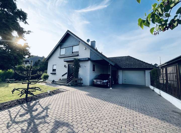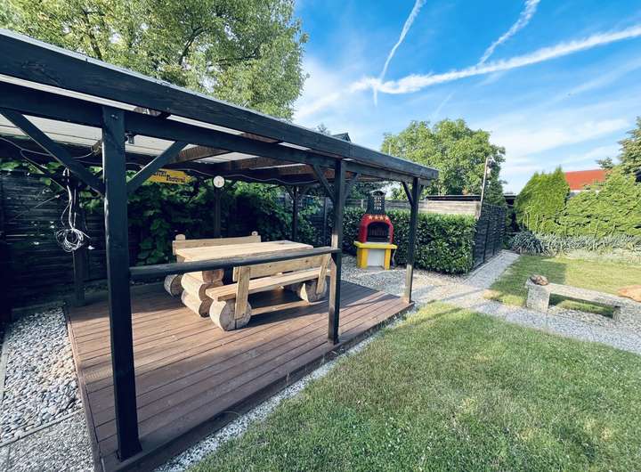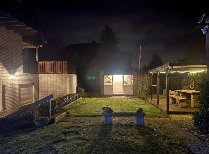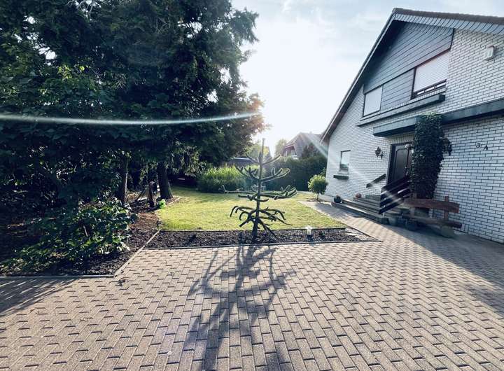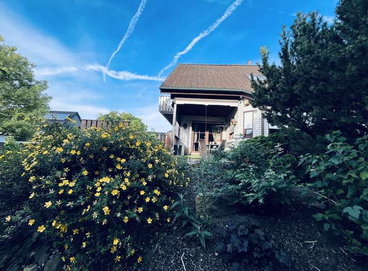 Auf dem 1.001 m² großen Grundstück befindet sich das Zweifamilienhaus mit separatem Eingang zur Einliegerwohnung, eine massiv gemauerte Garage mit angrenzendem Carport. Im hinteren Teil des Grundstücks befindet sich ein massiv gemauertes Gartenhaus mit Vorbau und einer überdachten Ruheoase. Auf der rechten Seite entlang der Grundstücksgrenze befindet sich ein abgeschirmter Holzlagerplatz für den Kamin.
