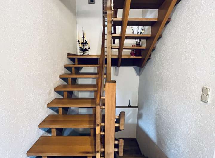 Durch eine Echtholztreppe gelangt man in das Obergeschoss,. Es gliedert sich in ein Elternschlafzimmer, zwei Kinderzimmer und ein Familienbad mit Badewanne, Dusche und zwei Waschbecken.