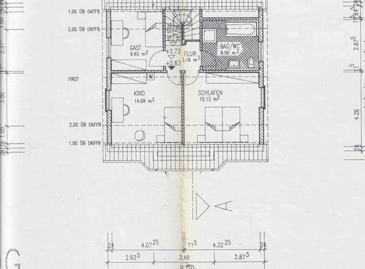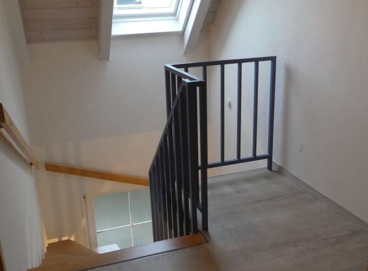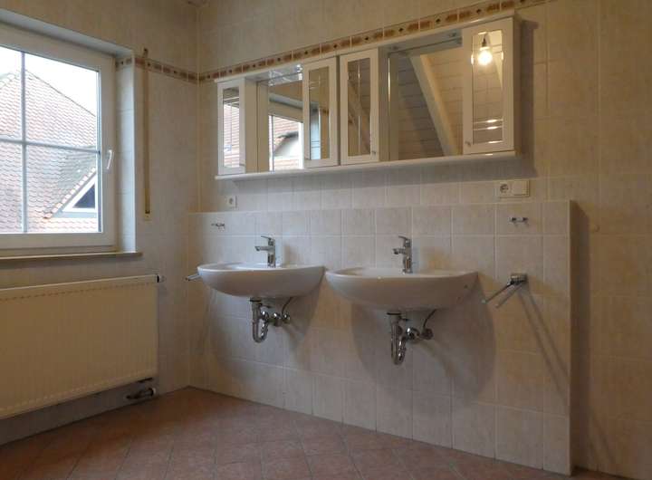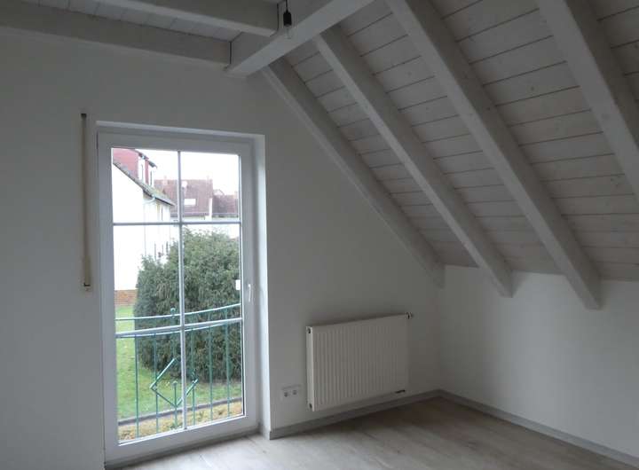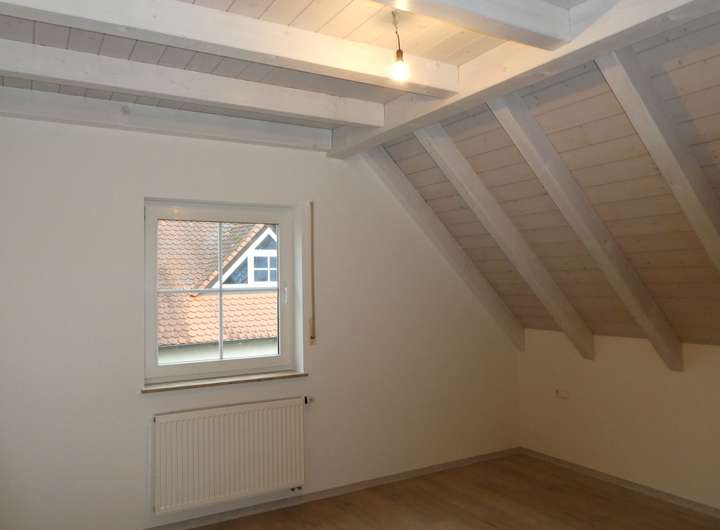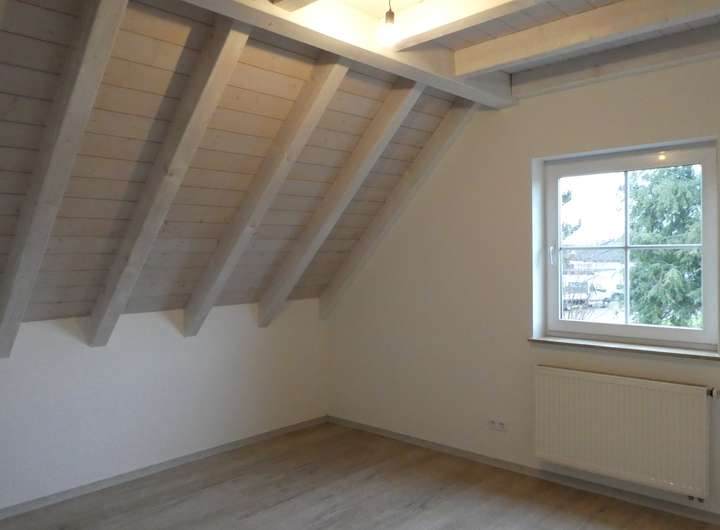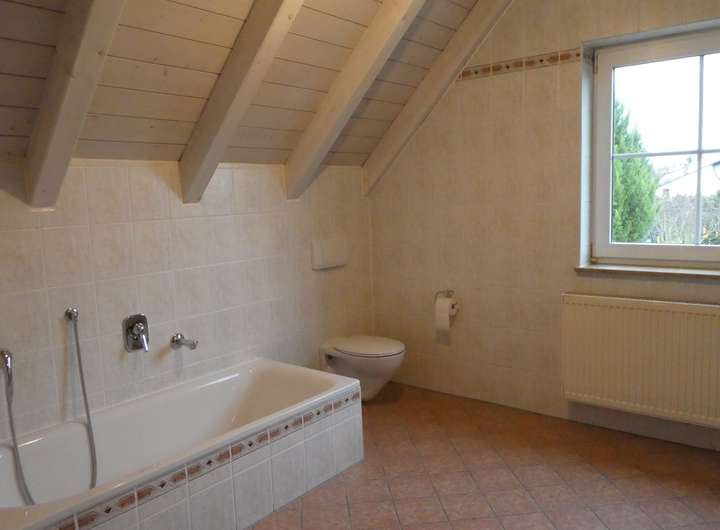 Im DG ist ein großes Bad mit zwei Waschbecken, Badewanne, Dusche und WC, sowie ein Schlafzimmer, ein Kinderzimmer und ein Arbeitszimmer untergebracht. Alle Zimmer im DG verfügen über einen sichtbaren Dachstuhl mit Aufdach-Dämmung. Die Decken wurden zusätzlich wärmegedämmt. Alle Kunststofffenster mit Isolierverglasung sind mit Rollläden ausgestattet.