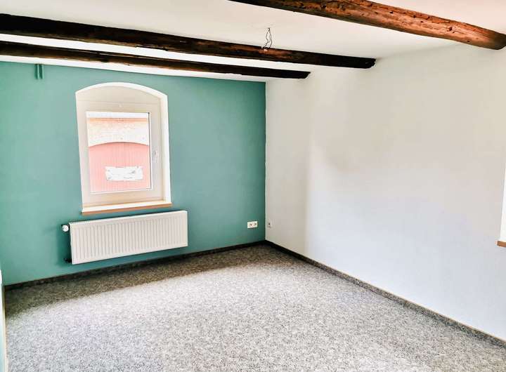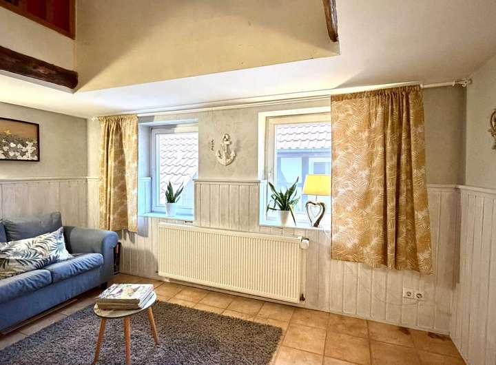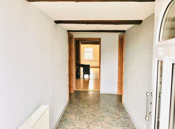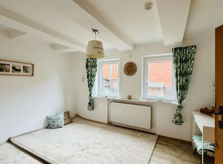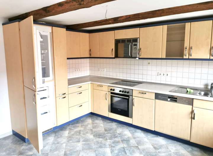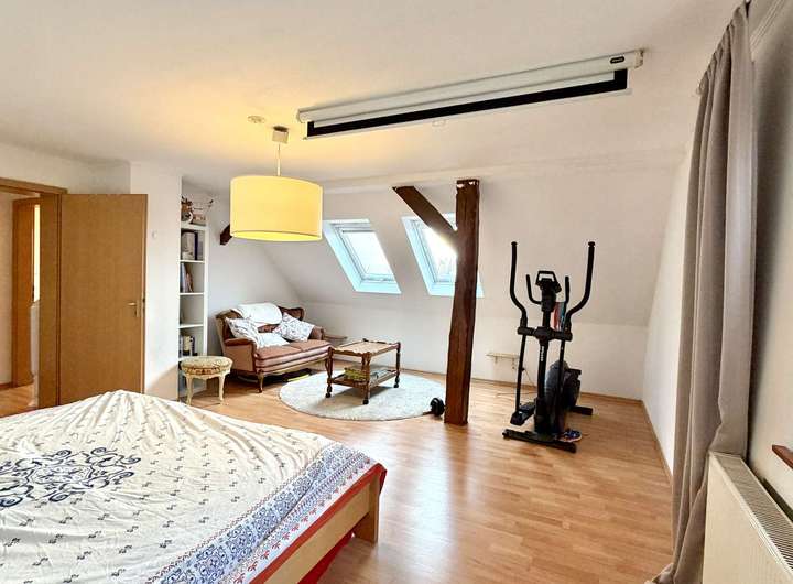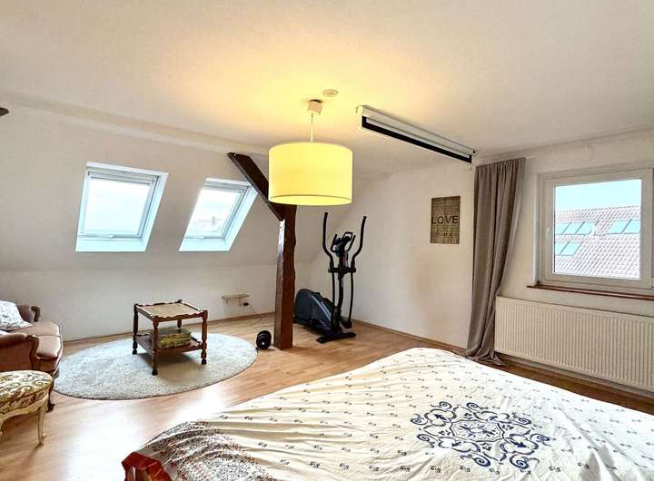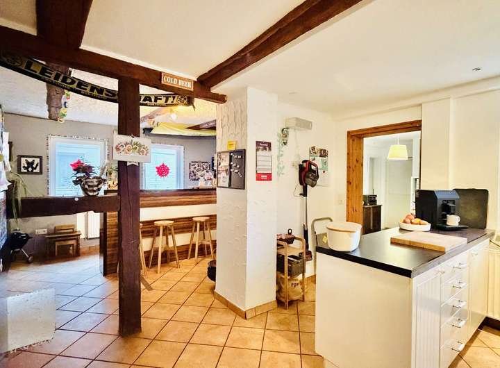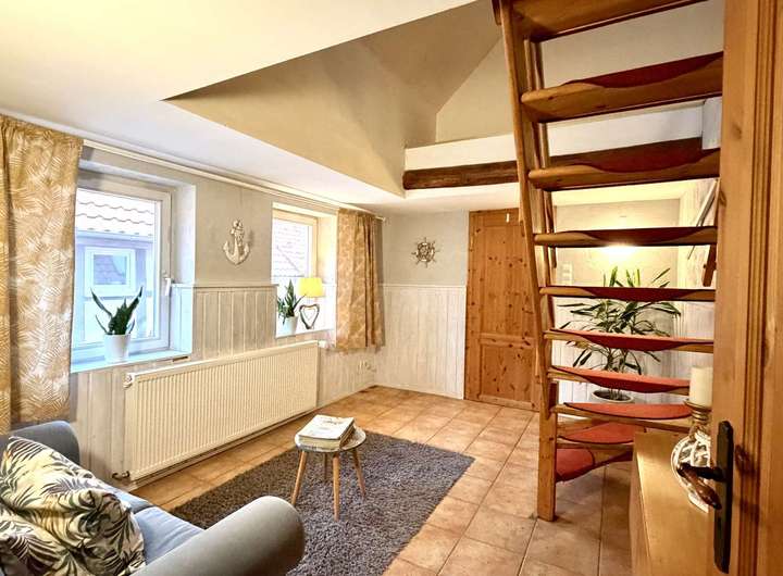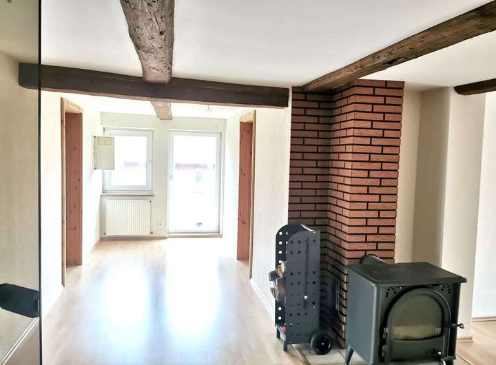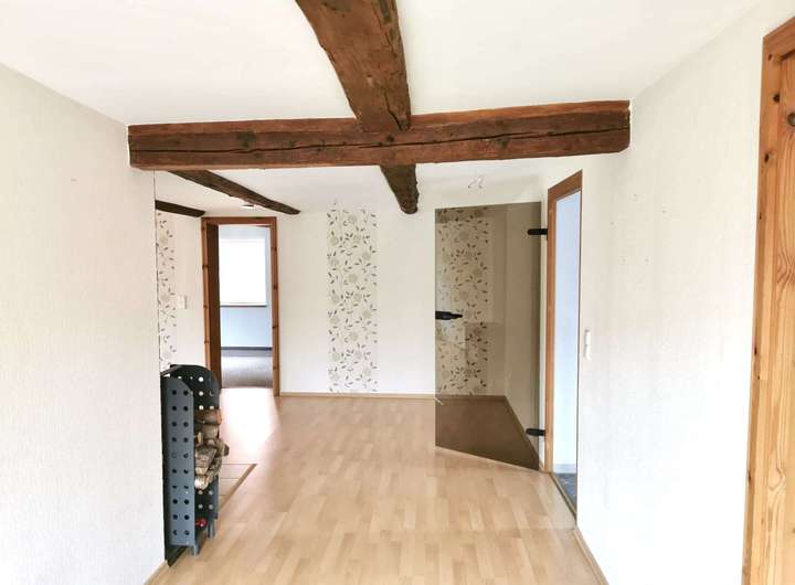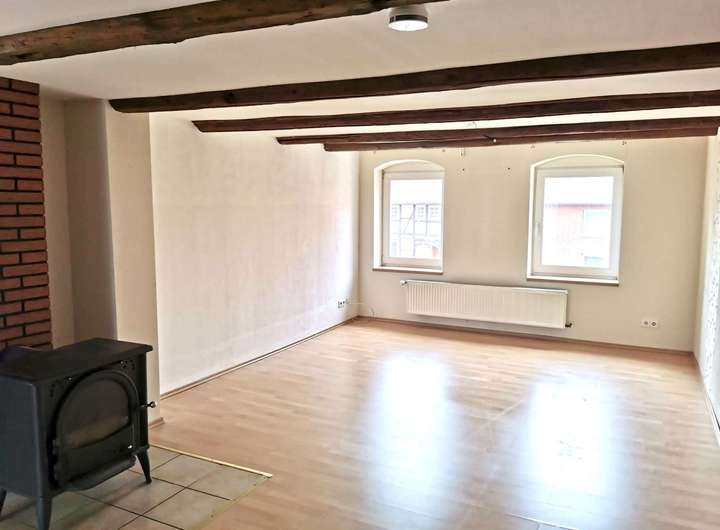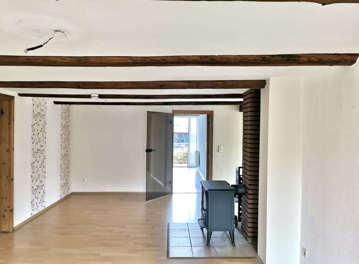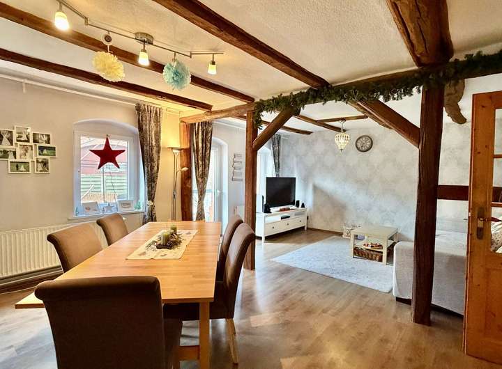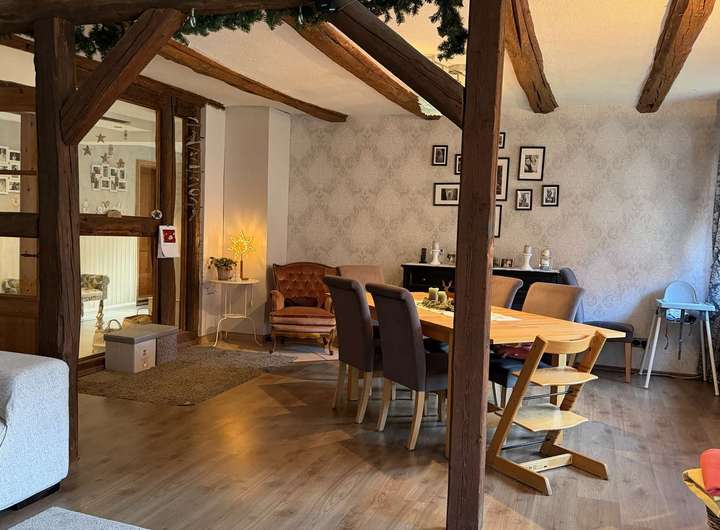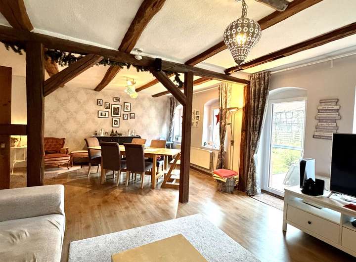 Der großzügige Wohnbereich befindet sich im hinteren Teil des Erdgeschosses und geht offen in den Essbereich über. Durch diese offene Gestaltung entsteht ein helles und angenehmes Wohnambiente, das zugleich den charakteristischen Charme des Fachwerks bewahrt.