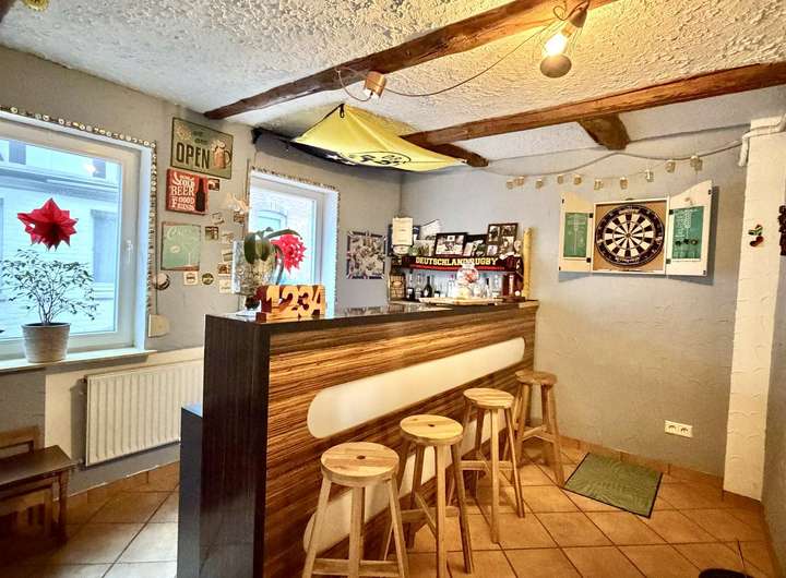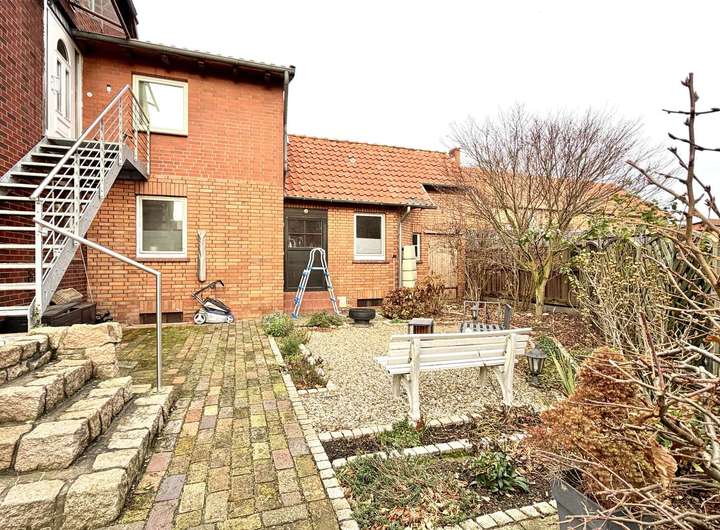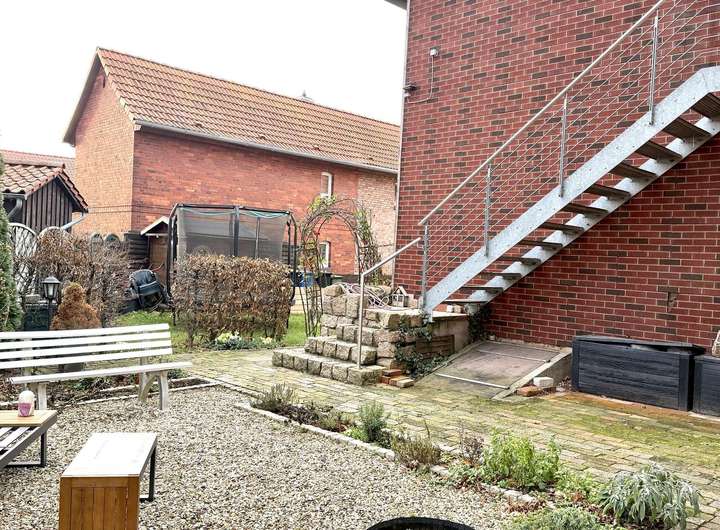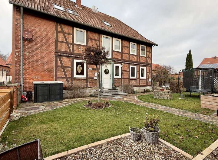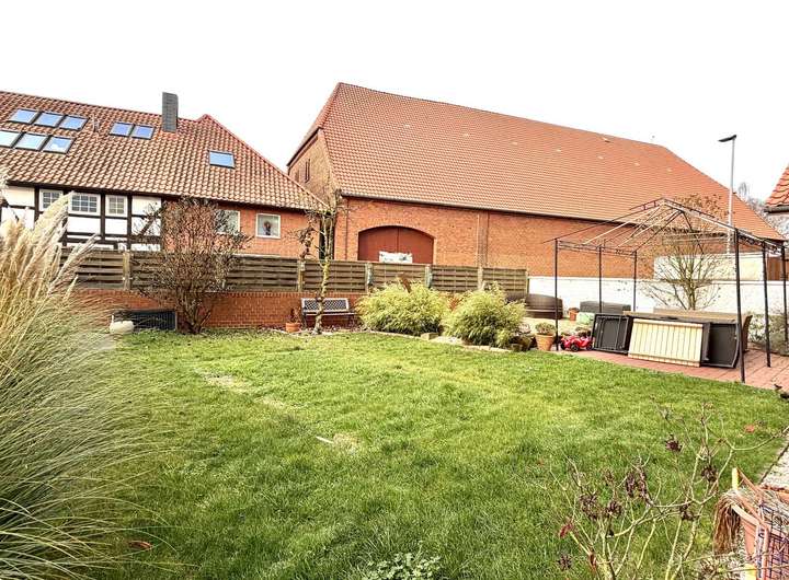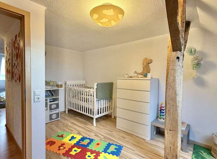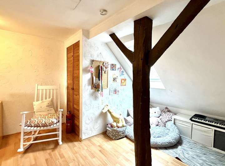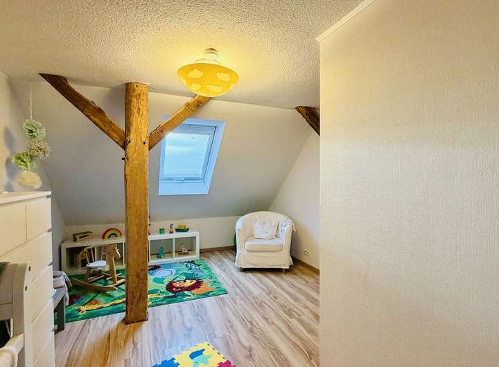 Dieses charaktervolle Fachwerkhaus bietet viel Raum für individuelle Gestaltungsmöglichkeiten. Die Immobilie besticht durch die für historische Holzbauten typischen Sichtbalken, die den besonderen Charme des Fachwerks unterstreichen. Ergänzt wird das Angebot durch einen großzügigen Garten mit weitläufigen Grünflächen, einem Sandkasten für Kinder sowie mehreren gemütlich angelegten Bereichen, die zum Verweilen einladen.