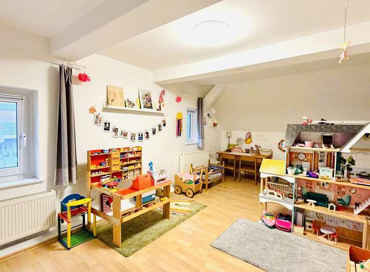 Dachgeschoß: Das Dachgeschoss ist über einen Flur erschlossen. Von hier aus sind zwei Kinderzimmer erreichbar, die sich gut für Spiel-, Lern- oder Schlafbereiche eignen. Ergänzt wird diese Ebene durch das Schlafzimmer, dem ein begehbarer Kleiderschrank zugeordnet ist und der zusätzlichen Stauraum bietet.