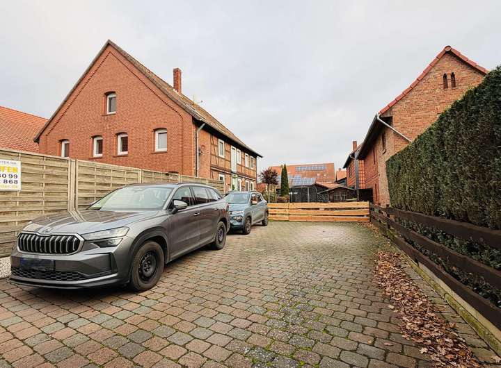 Einfahrt: Sie präsentiert sich einladend und freundlich und bietet mit vier Einstellplätzen ausreichend Platz für die Fahrzeuge der Familie sowie für Gäste oder Mieter.