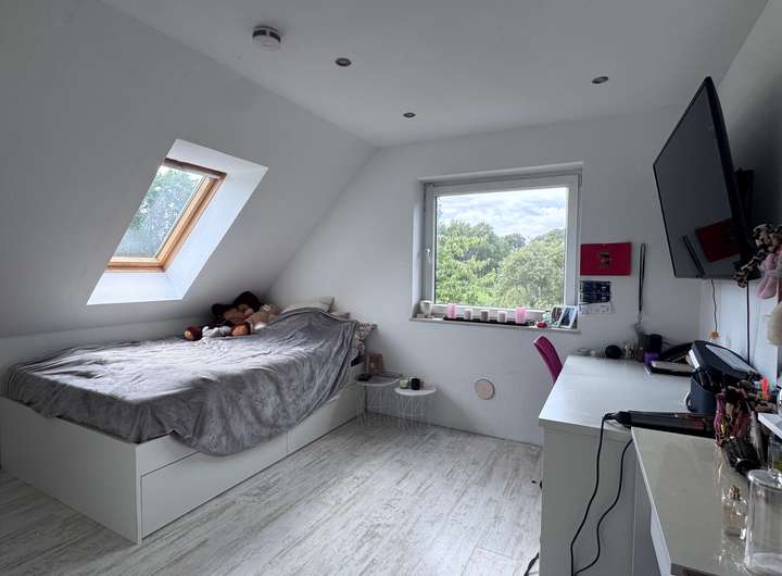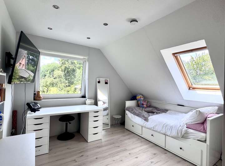 Das Einfamilienhaus wurde in zweischaliger Massivbauweise mit weiß bossiertem Vollklinker errichtet und bietet eine Wohnfläche von ca. 166,57 m². Die offene Architektur in Kombination mit großen Fensterflächen schafft ein lichtdurchflutetes, freundliches Wohnambiente. Der ausgebaute Dachboden ist zusätzlich isoliert – sowohl in den Dachschrägen als auch im Zwischenboden – und bietet wertvollen zusätzlichen Raum.