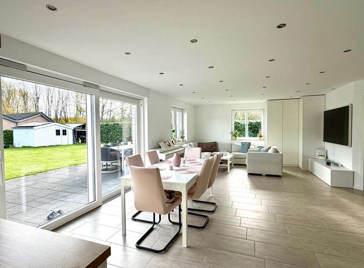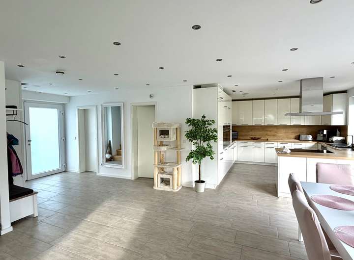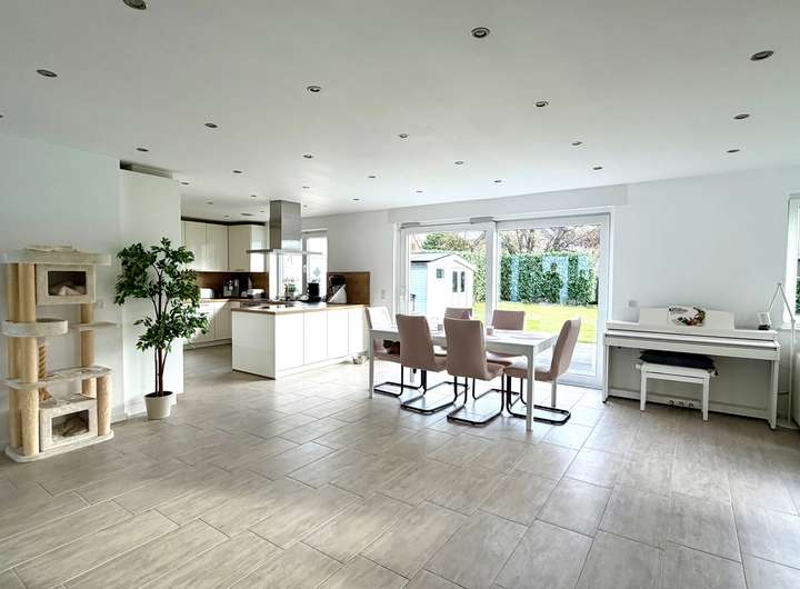 Die offene und helle Raumgestaltung sorgt für eine freundliche Wohnatmosphäre und bietet viel Platz zum Leben. Wohn-, Essbereich und Küche sind offen miteinander verbunden und bilden das Herzstück des Hauses. Große Fensterflächen geben den Blick in den Garten frei und lassen viel Tageslicht in die Räume. Der gesamte Wohnbereich ist einheitlich gefliest, was für ein pflegeleichtes und modernes Wohnambiente sorgt. Vom Essbereich aus gelangt man direkt auf die Terrasse, wodurch der Innen- und Außenbereich harmonisch miteinander verbunden werden.