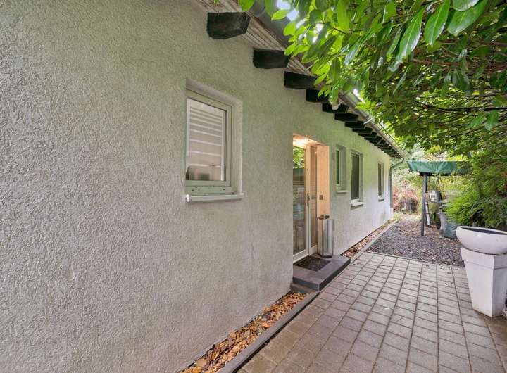 Das Haus liegt leicht verborgen hinter üppigem Grün und ist von der Straße aus kaum wahrnehmbar. Dadurch entsteht ein hoher Grad an Privatsphäre und ein naturnahes Ambiente, das dem Objekt einen besonderen Charakter verleiht.